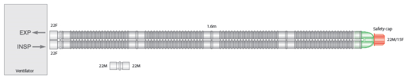 Faltenschlauch-System bestehend aus 2 Schläuchen 22mm, Y-Stück und Sicherheitskappe. Enthält zusätzlich geraden Adapter 22AD, um Geräteport von 22ID auf 22AD zu konvertieren.
